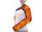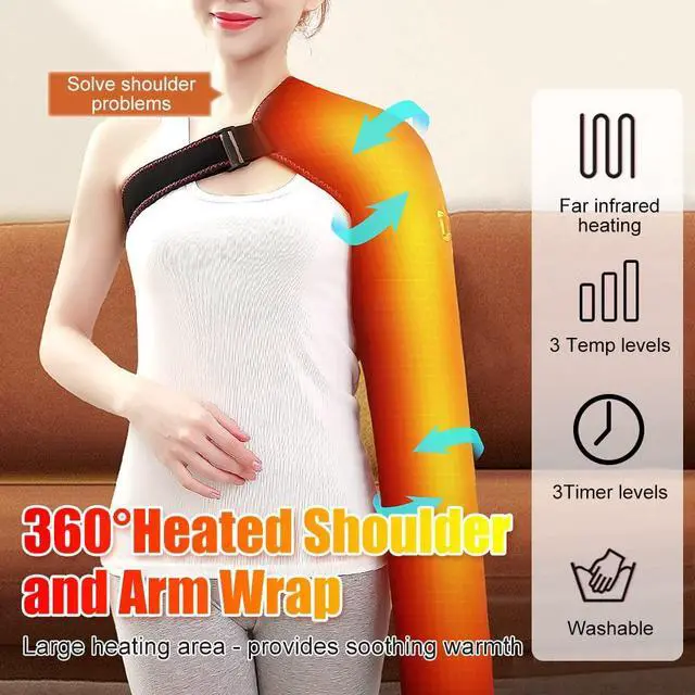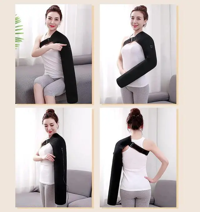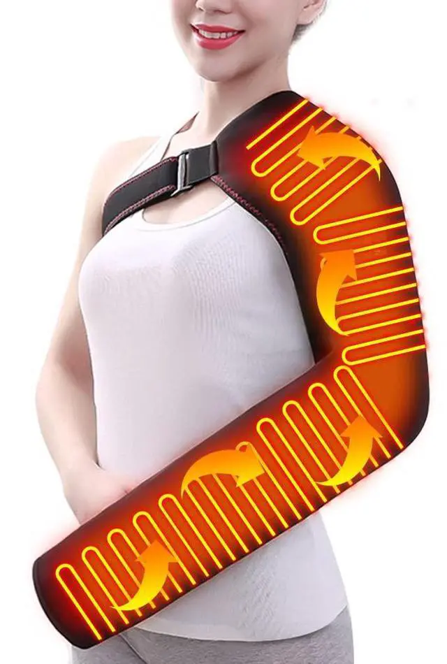 - Put your arm and shoulder inside the heating pad, guide the elastic strap under your opposite arm, thread it through the front buckle, adjust the length for a comfortable fit, and fasten securely.