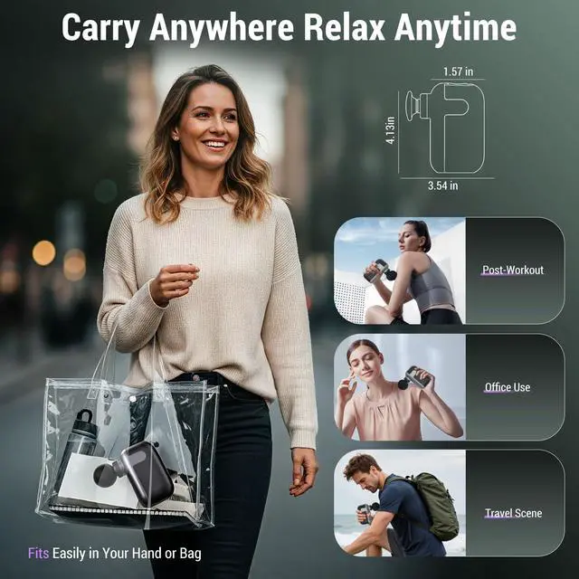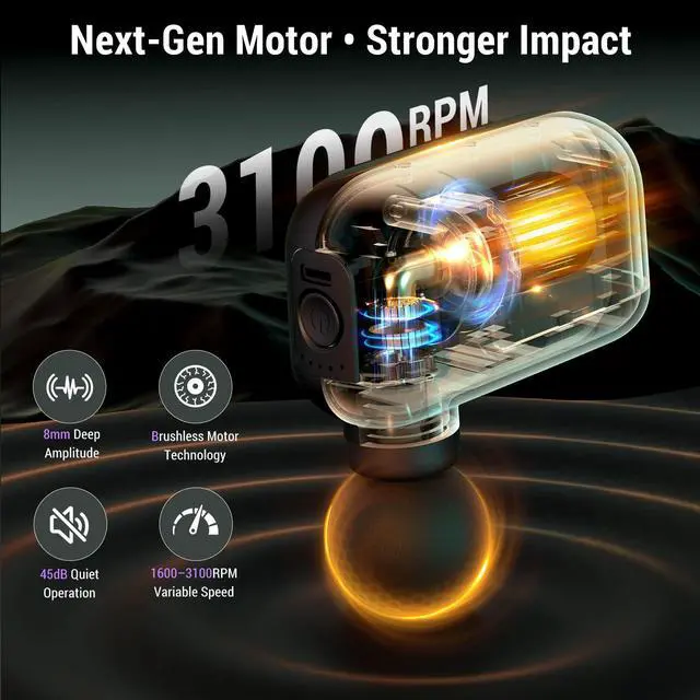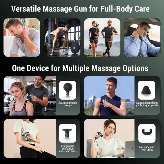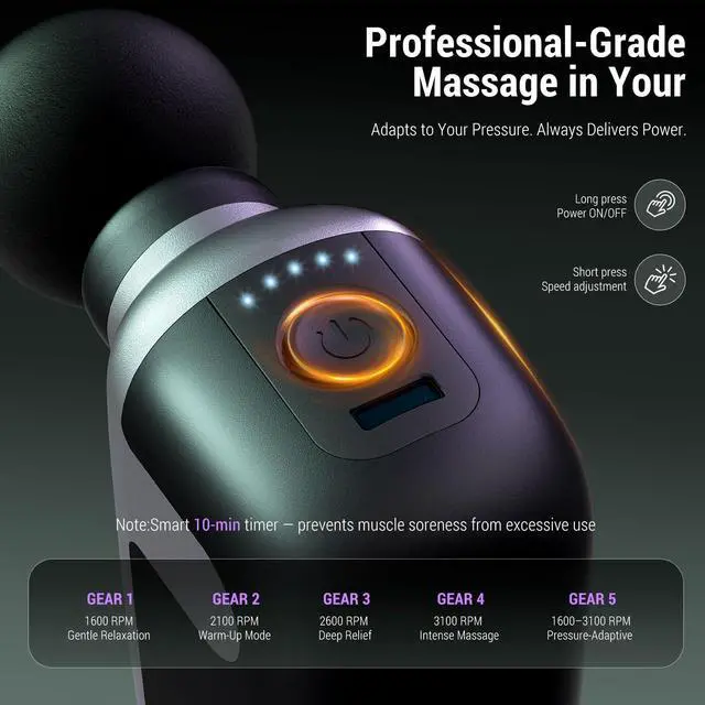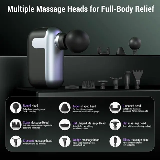 Professional Muscle Relief Anytime Experience deep tissue relaxation with this compact, handheld massage gun. Equipped with a high-torque brushless motor and 5 adjustable speeds (16003100 RPM) with 8mm amplitude, it effectively loosens tight muscles,soothes tired muscles, and supports post-workout recovery. Running under 45dB, it ensures quiet, comfortable sessions while delivering consistent power. Customizable Massage Experience Featuring 9 interchangeable massage heads, this percussion gun allows you to target neck, shoulders, back, arms, legs, and feet. Switch easily between gentle and deep tissue massage for tailored intensity, ensuring a fully personalized massage experience. The ergonomic design ensures comfort even during extended use. Portable & Travel-Ready Weighing just 0.5 lb and measuring 4.13 x 3.54 x 1.57 inches, this mini massage gun is ultra-compact and perfect for on-the-go relief. Slip it into your gym bag, backpack, or suitcase to relieve tension anytimeafter workouts, long hours at a desk, or while traveling. Long-Lasting Power Equipped with a 3C Power Battery, enjoy up to 57 hours of continuous use on a single charge. Fast Type-C charging fully recharges the device in just 3.5 hours. The built-in 10-minute auto-off prevents overuse and protects your muscles and skin while preserving battery life, ensuring safe and reliable performance every time. Ideal Gift & Support Sleek, portable, and powerful, this mini percussion massage gun makes a thoughtful gift for birthdays, holidays, or special occasions. Backed by a 5-year warranty and responsive 24-hour customer support, it offers peace of mind, long-lasting comfort, and a premium wellness experience for friends, family, or yourself. Perfect for: gym enthusiasts, athletes, office workers, travelers, seniors, and anyone seeking fast, convenient, professional muscle relaxation at home or on the go.
