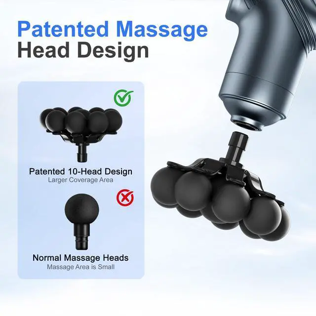Patent Design:This massage head is built around a patented cluster of ten matte-black massage balls, all fused into one smart unit. Theyre arranged like a honeycombone in the center, surrounded by three outer ringscreating a stable grid that delivers deep, even pressure. At 10 inches wide, the cluster hugs your bodys curves, so all ten balls work together to cover more area and relieve muscles evenly.
