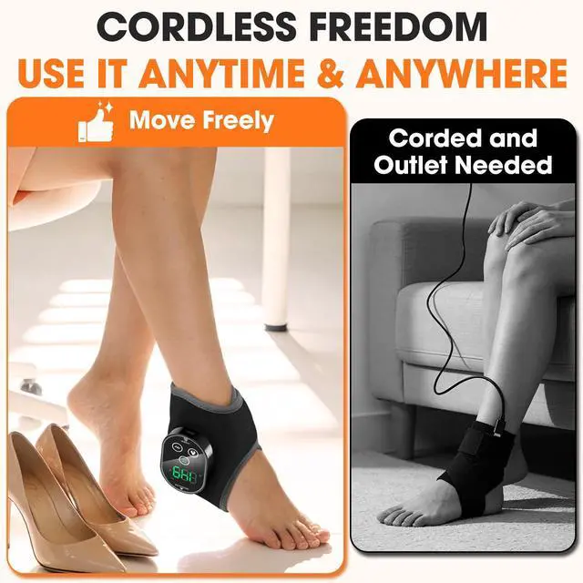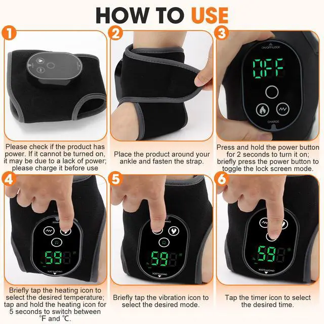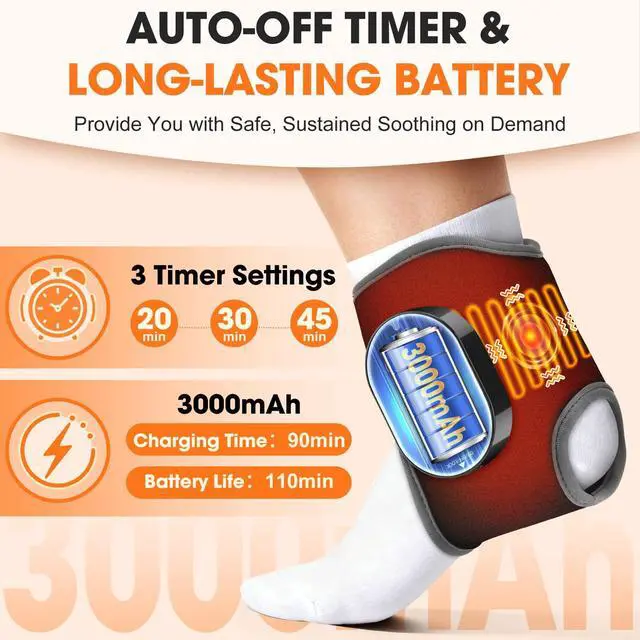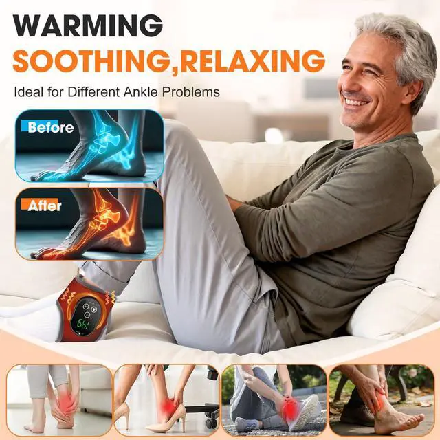 ANKLE PAIN RELIEF: With 4 levels of warming function to promote circulation, paired with 3 levels of vibration massage to relax muscle stiffness, it helps alleviate post-exercise soreness and swelling. Please select the appropriate function and intensity based on your personal comfort. Refrain from using the heating and vibration ankle wrap if there is redness, swelling, or external injury