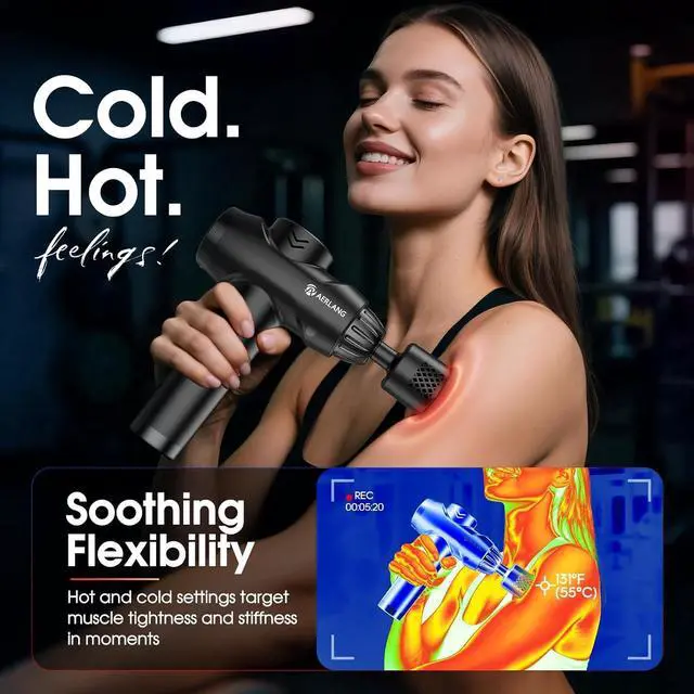 Hot and Cold Deep Massage: This percussion massage gun features three adjustable heat and cool settings (cold: 44°F-50°F-55°F) (hot: 113°F-122°F-131°F), allowing you to tailor the experience to your preferences for optimal post-workout recovery and relaxation