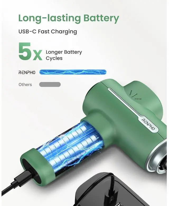 Convenient USB-Type C Charging: No need to worry about charging when traveling, this rechargeable massager gun can be charged using a 5V/2A adapter (not included) or a power bank. Ensure to fully charge the massager before its initial use