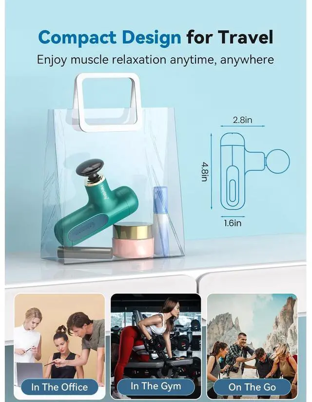 Mini Design for Your PocketOur mini massage gun only weights 0.6lbs, which can be easily put in both bags and pockets. The ergonomic T-shaped design and skin like feel makes you love it, and you can easily carry it in the gym, office and traveling to relax yourself.