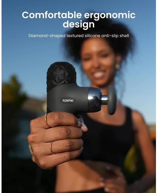 Where Elegance Finds its Grip: Ergonomically crafted to fit your hand perfectly, this percussion massage gun reduces strain. Its diamond-textured silicone casing ensures a secure, non-slip hold for precise control during use