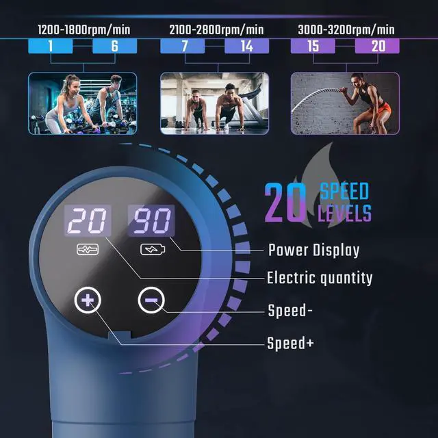 20 Speeds & 9 Massage Heads Interchangeable heads in 9 shapes to target specific muscle groups for faster recovery. Its easy and convenient to remove and affix massage heads in seconds. This handheld massage gun offers 20 different speed levels up to 3200 rpm, so you can easily find the vibration amplitude that suits you best, which provide you a different relaxing massage experiences.