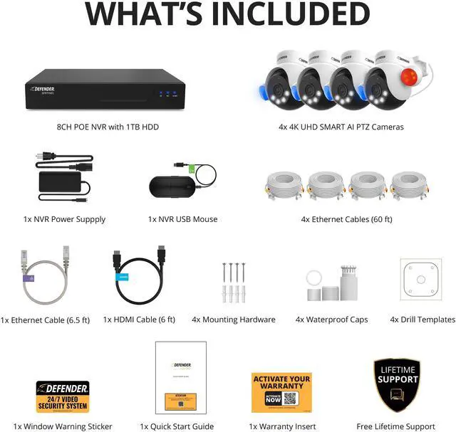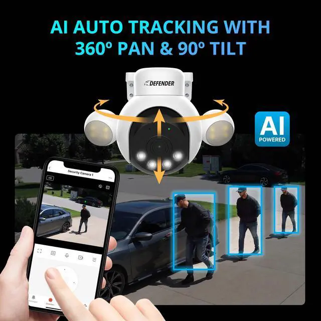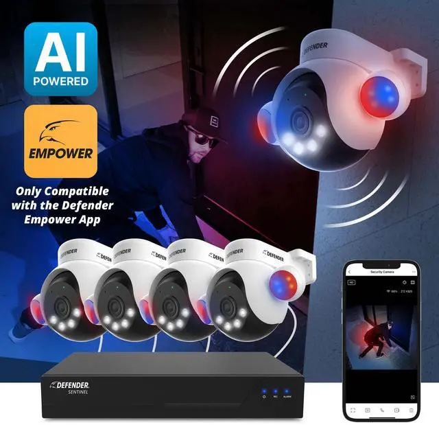 Defender AI Powered Sentinel 4K PTZ is a game-changer in intelligent home security. Packed with cutting edge features designed for your peace of mind. Leave blind spots in the past with a full 360° range. Track movement with Intelligent AI Auto-tracking and SMART Human Detection. Feel at ease with a full-suite of criminal deterrence capabilities, including blue-red flashing lights, siren and an LED spotlight. AI Powered Sentinel 4K PTZ is also equipped with Vibrant True Color Night vision, Two-Way Talk, and the free top-rated Empower app. ONLY compatible with Defender Empower app.