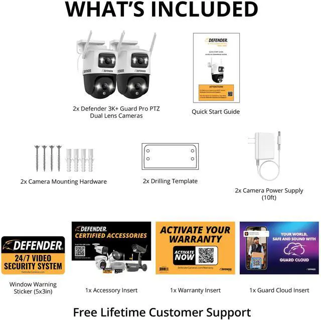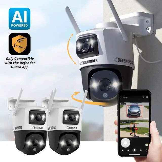 Unveiling the future of home surveillance technology. Incredible, limitless 3K PLUS clarity with dual lens for panoramic viewing. Stay secured with SMART AI-powered automatic human/vehicle tracking, or remotely pan, tilt & zoom your Guard Pro with the top-rated free mobile app. Integrated with active siren & strobe light deterrence so you can be alerted of trespassers immediately. 24/7 security that provides vibrant color footage, even in pitch darkness with color night vision capabilities. ONLY compatible with Defender Guard app. Can not be used with other Defender apps.