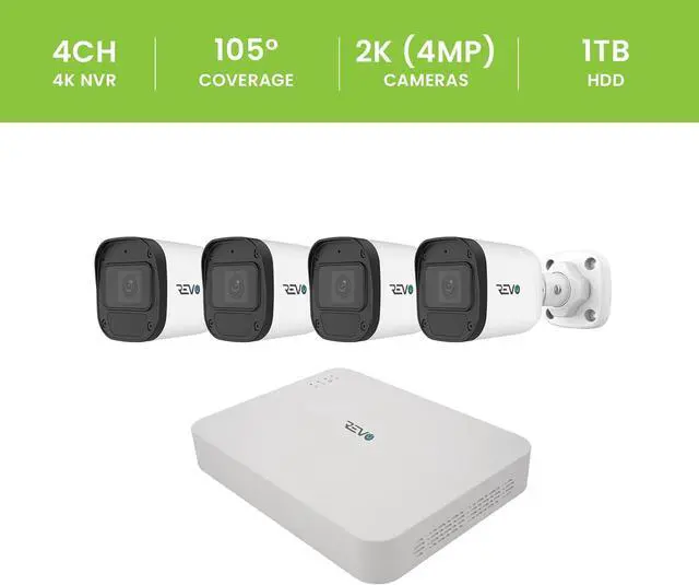 COMPLETE SYSTEM: Includes 4CH 4K NVR with 1TB hard drive, four 2K (4MP) cameras with built-in microphones, and four 60ft CAT5e cables