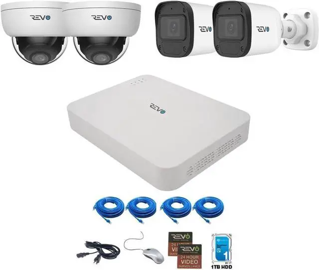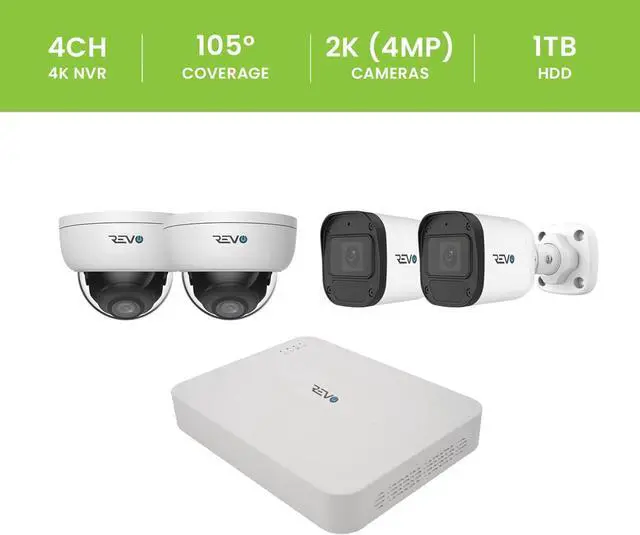 COMPLETE SYSTEM: 4-channel 4K NVR security system includes 4 high-resolution 2K (4MP) cameras, 1TB hard drive, and four 60ft CAT5e cables