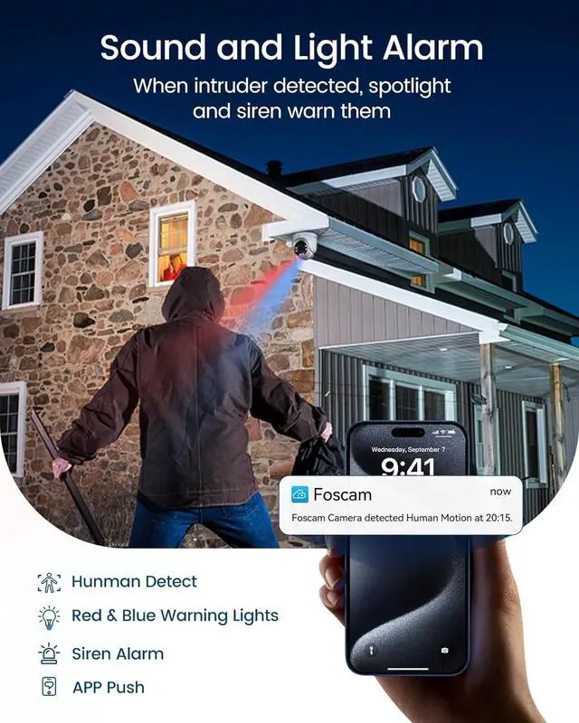 Flashing Red & Blue Light AlarmThe W5EP security camera features both a red and a blue warning light. When the Red & Blue Light Alarm is activated and motion is detected within its monitored zone, the camera instantly triggers an alert with the red and blue lights flashing alternately. This highly visible, police-style flashing pattern provides a much stronger visual deterrent than standard floodlights, effectively scaring off potential intruders.
