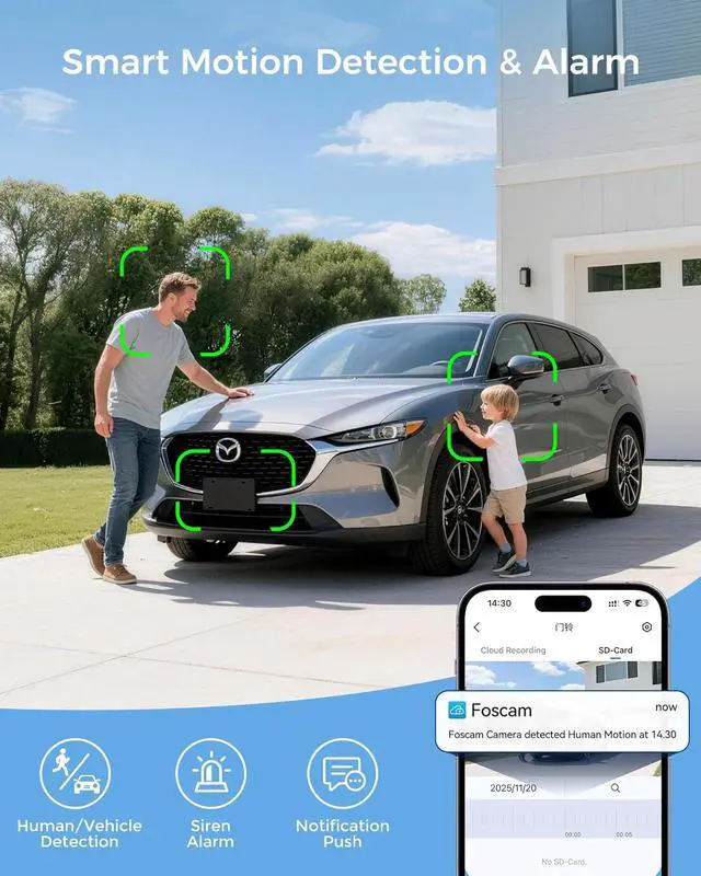 AI Human/Vehicle DetectionIntelligent AI Human/Vehicle Detection: Experience next-level protection with our advanced FOSCAM IP cameras. Featuring sophisticated human and vehicle detection, along with playback, auto-tracking, two-way audio, and motion-activated spotlights, our system provides comprehensive and responsive home security.