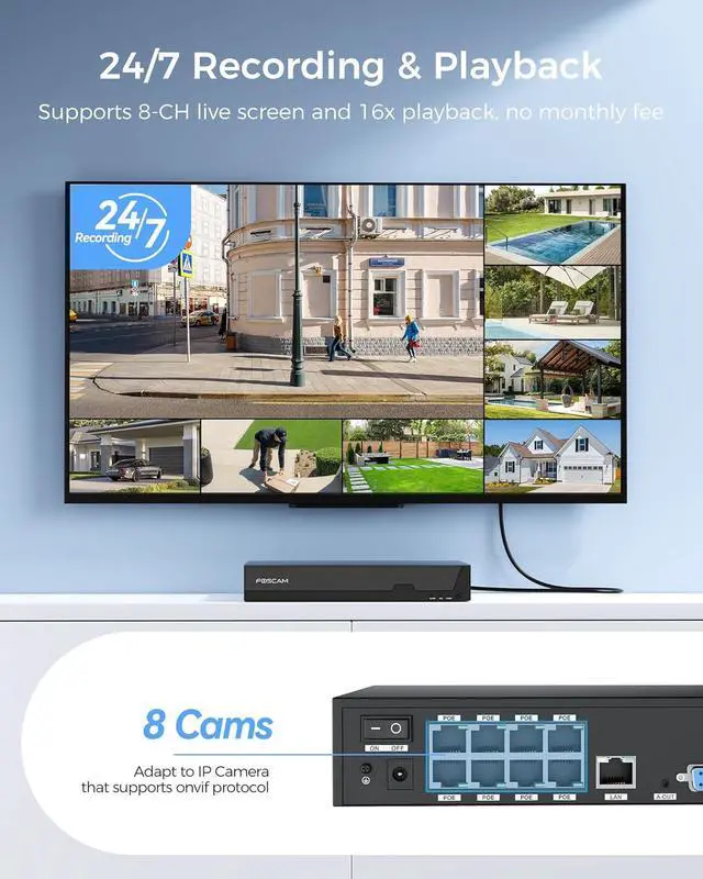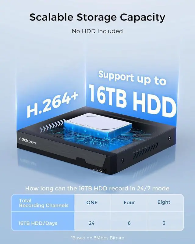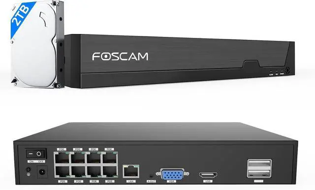 ONVIF-Compatible 8CH NVR2Work with ONVIF IP Cameras: Foscam 8 Channel POE NVR system plug and play compatible with most third-party ONVIF IP cameras. this top-tier system supports up to 8 channels of 8MP video recording simultaneously and is compatible up to 16TB HDD capacity (Includes a 2TB hard drive).