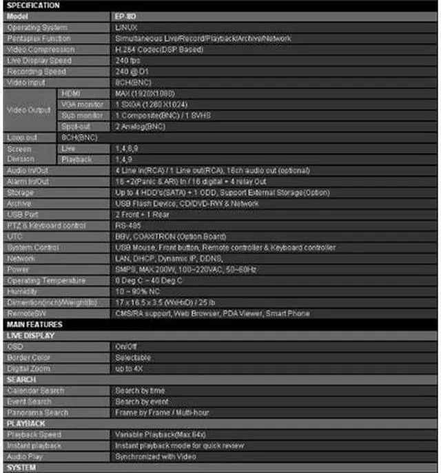 •Real-time Recording speed 240FPS(NTSC)/240(PAL) @ D1