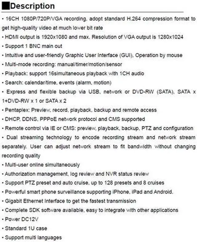 •16CH 1080P/720P/VGA recording, adopt standard H.264 compression format to gethigh-quality video at much lower bit rate