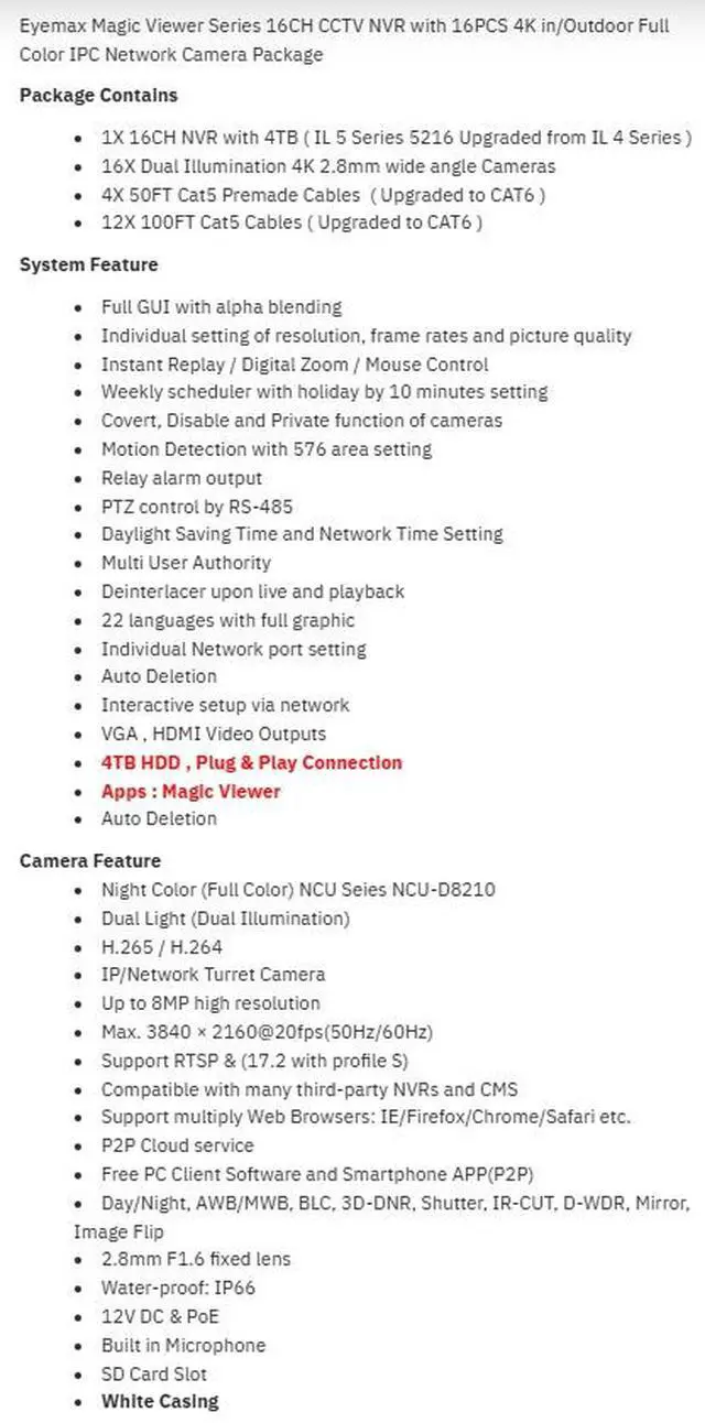Eyemax Magic Viewer Series 16CH CCTV NVR with 16PCS 4K in/Outdoor Full Color IPC Network Camera Package