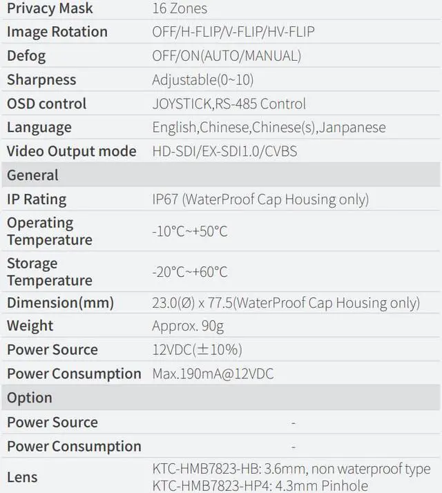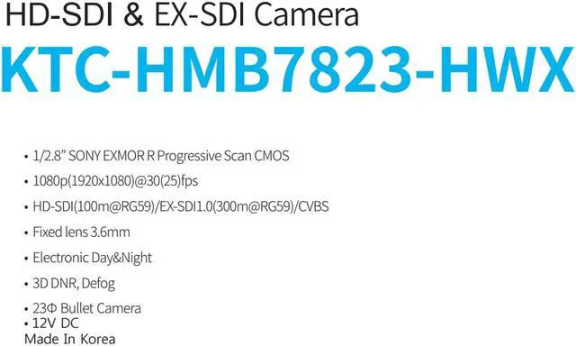 KTnC KTC-HMB7823-HWX HD-SDI, EX SDI bullet camera Full 1080p 2 Megapixel, 3.6mm lens, Sony CMOS, OSD ( New Version of KPC-HDB230M ) -Optional Remote OSD controller-