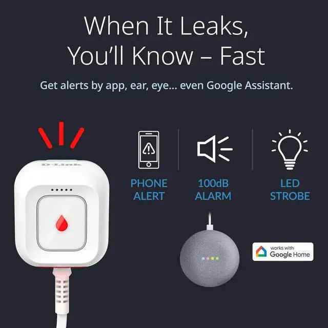 WATER LEAK DETECTION WITH MULTI-ALERT SYSTEM: When water touches a sensor, you get a phone alert, a loud 100dB siren sounds, an LED strobe flashes