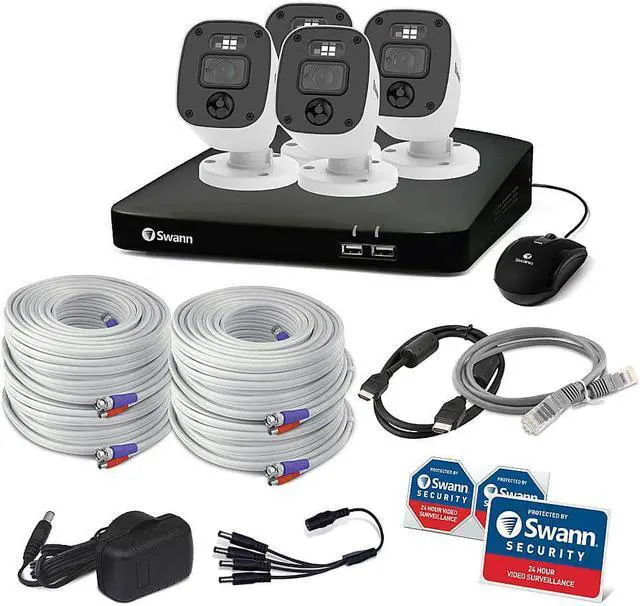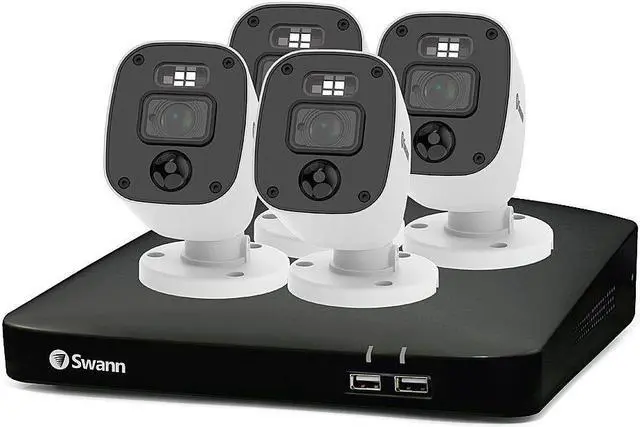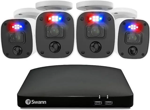Mount the cameras inside or outdoors as their weatherproof design is built to withstand rain, snow and heat, all year round. Enjoy free local recording onto the massive 1TB hard drive with no fees ever and the option to backup video securely to your Dropbox account. With the Swann Security app, you can even watch live or playback video on your smartphone from anywhere in the world. You can also speak to see via the Google Assistant or Alexa. The Enforcer Security System combines video surveillance and flashing lights to be an all in one crime prevention solution for any home or business.