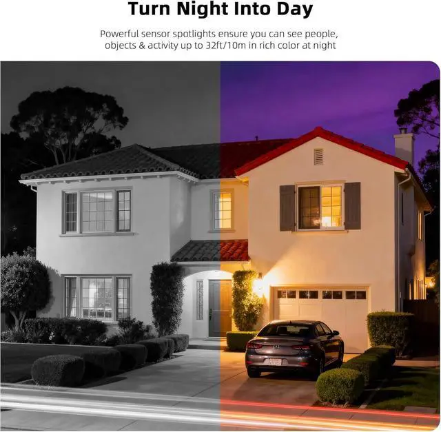 5MP Super HD & Color Night VisionCapture crystal-clear details like faces and license plates day or night. Powerful spotlights provide full-color visibility up to 32ft/10m in complete darkness, ensuring critical details are never missed.