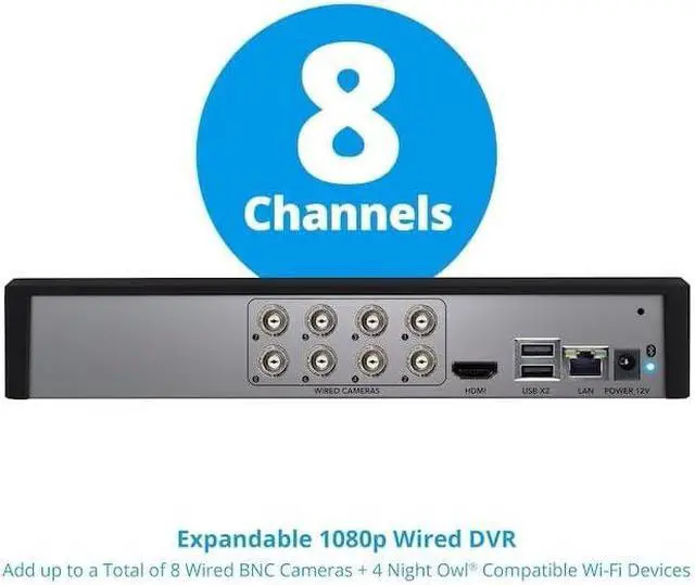 Connect up to 8 Compatible BNC Cameras (DP2, DP2BK, DP2LSA, CM-TA2L) and up to 4 Compatible Wireless IP Cameras (WNIP-2LTA series or WNIP2-SU video doorbell) Not backward compatible with older Night Owl 1080p cameras