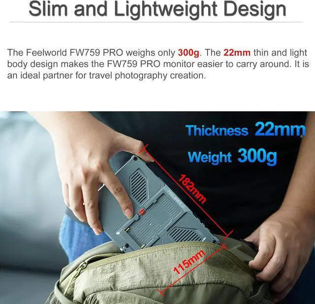 1.[Small and Slim] The Feelworld FW759 PRO weighs only 300g. The 22mm thin and light body design makes the FW759 PRO monitor easier to carry around. It is an ideal partner for travel photography creation.