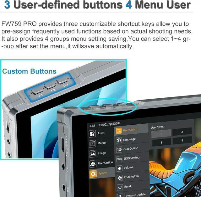 3.[4K HDMI &AV Input] The FW759 PRO monitor support 4K 30Hz signal input for clear and smooth monitoring. Compatible with the latest DSLR cameras on the market. And also provides AV interface and a 3.5mm headphonejack to monitor audio.