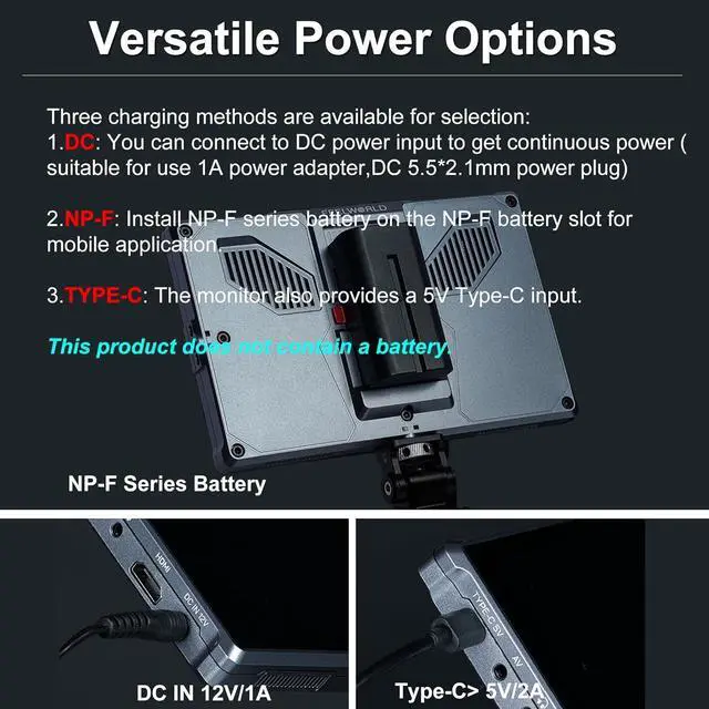 4.[Versatile Power Options] Three charging methods are available for selection: DC, NP-F, and TYPE-C. You can connect to DC power input to get continuous power (suitable for use 1A power adapter,DC 5.5*2.1mm power plug) or install NP-F series battery on the NP-F battery slot for mobile application. The monitor also provides a 5V Type-C input. (This product does not contain a battery)