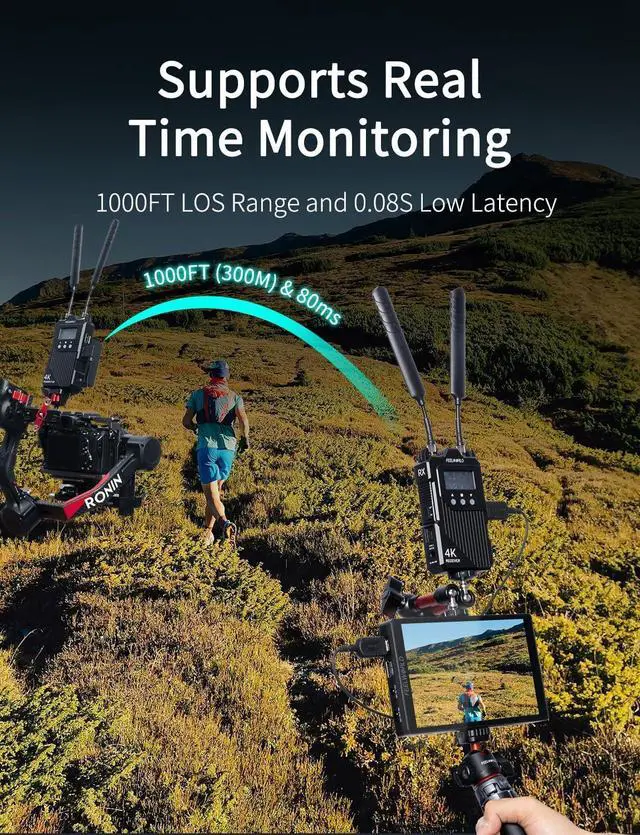 1000ft Range & 0.08s Ultra-Low LatencyEnjoy real-time monitoring with the WT1Hs impressive 1000ft (300m) transmission range and ultra-low 0.08s latency. This wireless video transmitter and receiver system ensures stable, long-distance signal delivery, for outdoor shoots and live events