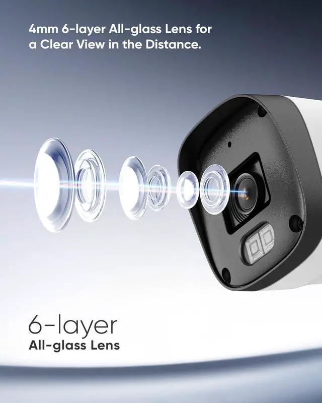 100ft Dual IR Night Vision & 4mm Lens2 infrared arrays + 6-layer glass lens provide 100ft night vision. Smart IR-cut filter auto-switches day/night modes, while 3D digital noise reduction eliminates grain.
