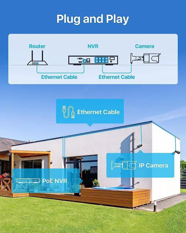 (2). [ Simple Plug & Play PoE Setup ] __ A single network cabling provides both video and power to your cameras, no longer need to install your security cameras to a power outlet nearby, more stable and reliable than wireless security system.