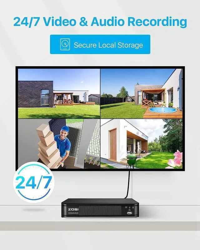 (4). [ Customize Each Camera with Different Record Modes ] __Our ZOSI NVR offers 4 kinds recording modes to meet your needs: Record footage 24/7 continuously, Record during scheduled times, Only record when detect motion, Recycle record. You can customize each camera with different recording modes, and download the recording files for the USB backup. (2TB Security Grade Hard Drive Included)