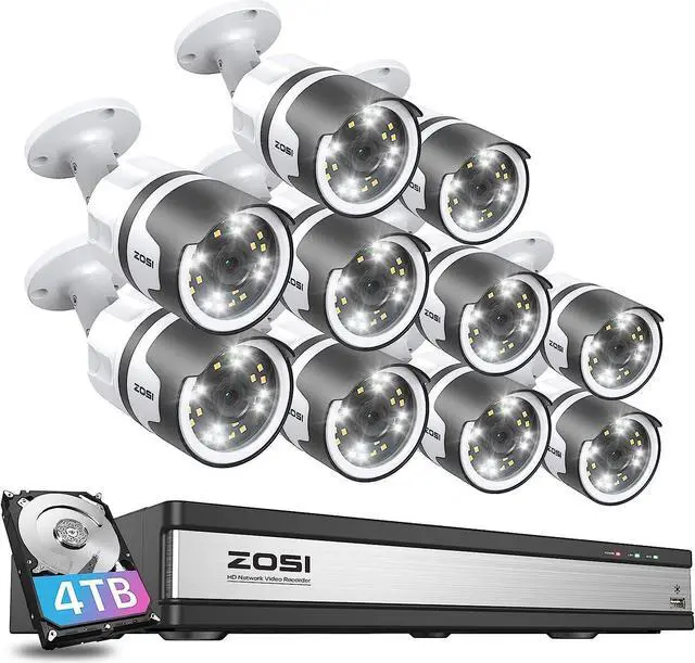 (1). [ 5MP HD & Spotlights ] __ Featuring our H. 265+ 16CH 4K PoE NVR Recorder and 10 x 5MP (3K) weatherproof IP PoE cameras with 100ft Color Night Vision capabilities, this system offers exceptional monitoring capabilities. With 6 additional open channels, you have the flexibility to add extra ZOSI 8MP, 5MP, or 2MP PoE cameras, making it an ideal solution for monitoring your expanding business or factory. The system also provides a 4TB Security Grade Hard Drive for convenient local storage.