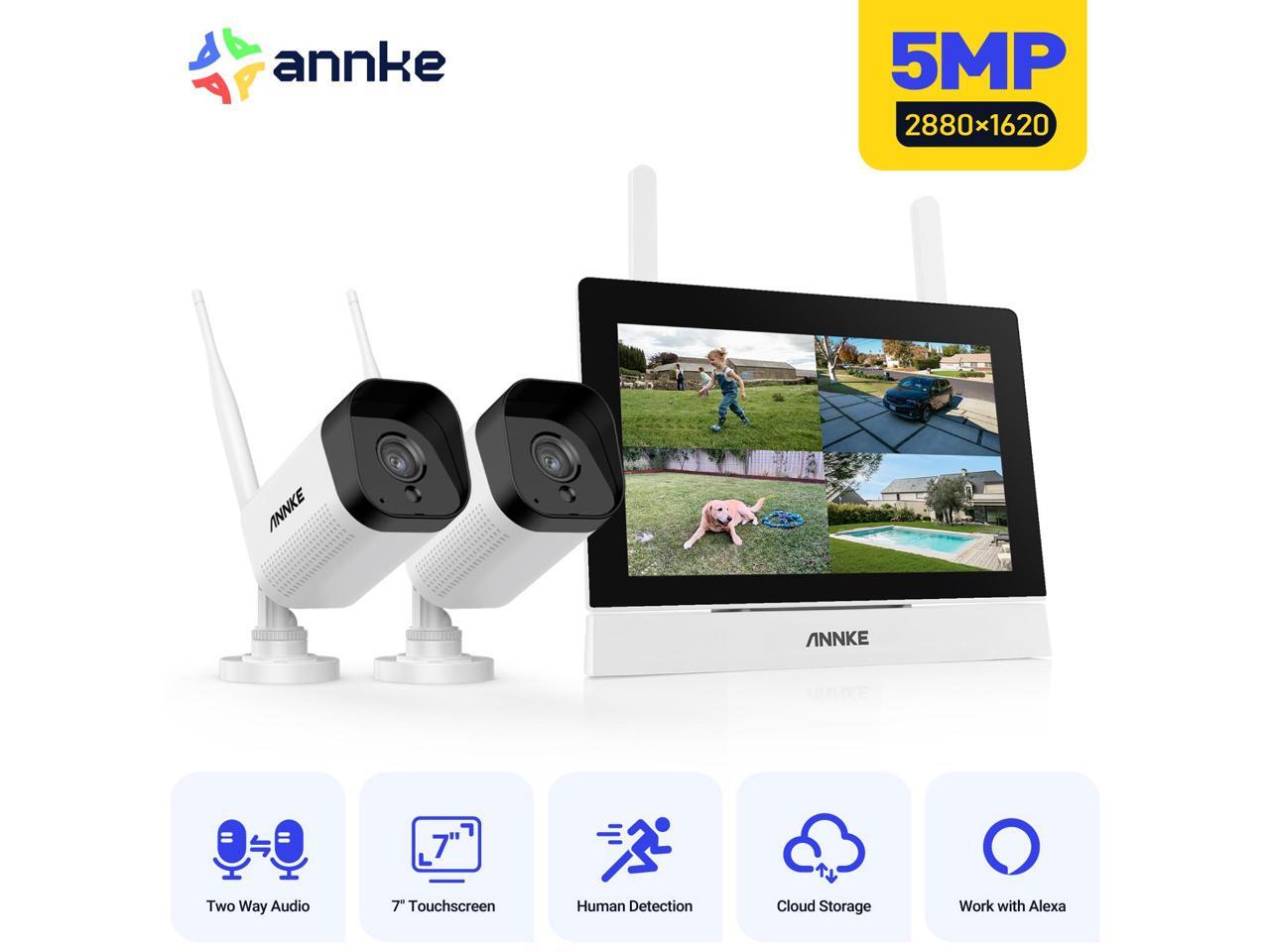 ANNKE Wireless Security Camera System with 7" HD Monitor, 4CH Expandable Home Surveillance System, IP66 Weatherproof 2pcs 5MP Indoor Outdoor Cameras, Night Vision, Motion Detection, No HDD, Bidirectio
