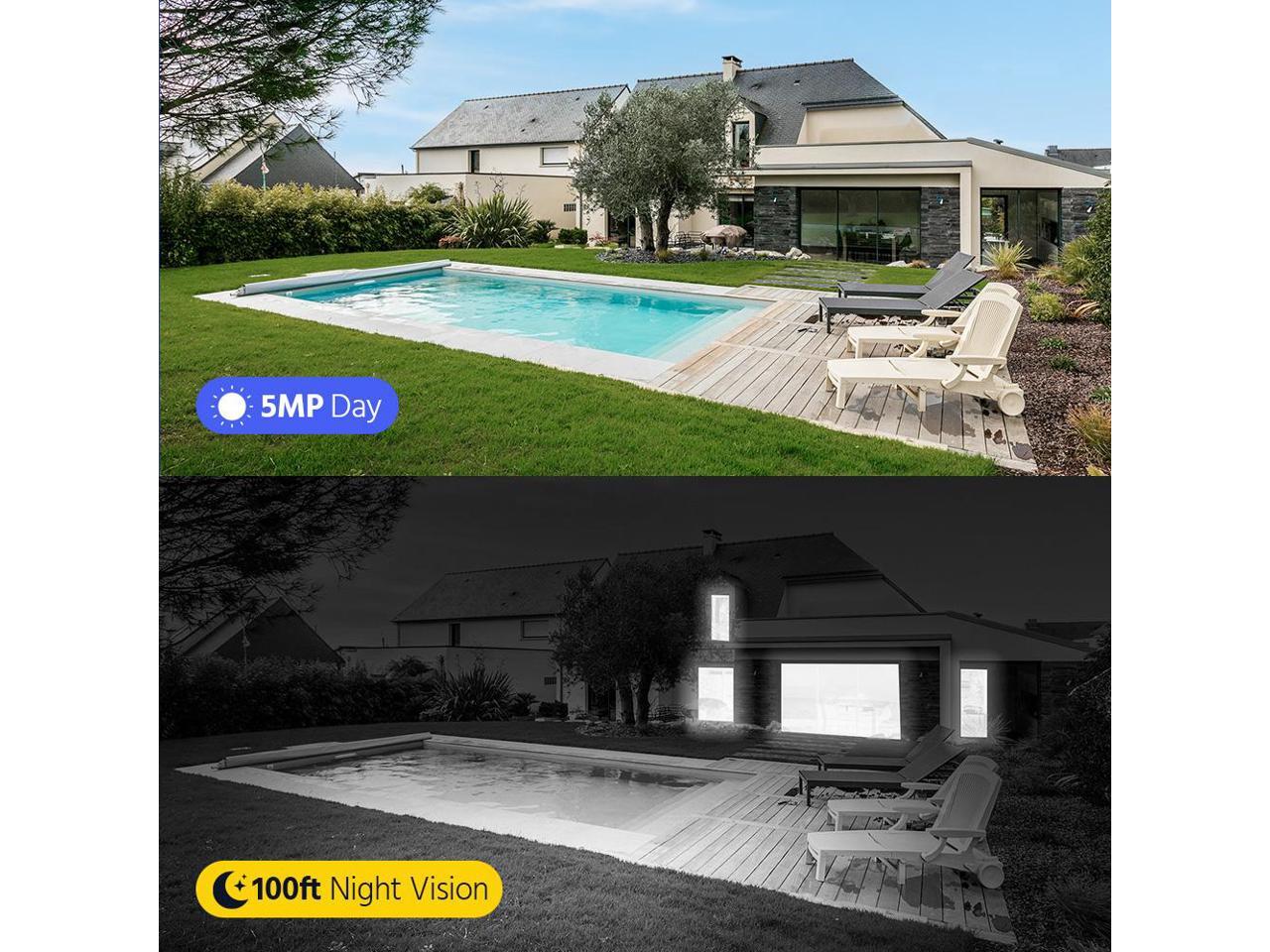 - IP66 weather resistant day and night dual-use camera: Full HD recording, capturing clear and sharp images, providing clear high-definition real-time video, ensuring clear and smooth day and night shooting with a 5-megapixel external camera. Continuous home monitoring day and night. Powerful night vision function. The Smart IR Cut night vision device automatically turns on in low light conditions, and the WiFi free camera has crystal clear night vision capabilities up to 100 feet, allowing for clear visibility even in the dark.