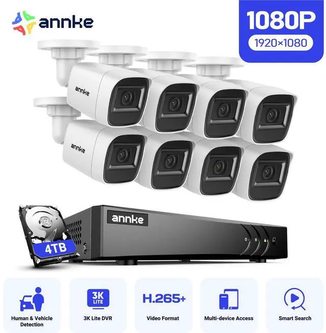 ANNKE 2MP Security Camera System, 8 Channel 3K Lite DVR Recorder with AI Motion Detection, 8X 1080P Add-on Wired Cameras with 65ft IR Night Vision, IP67, 3.6mm Lens, 4TB HDD, White