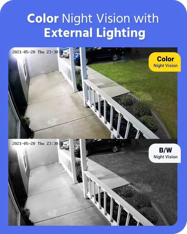 5MP Super HD & EXIR 2.0 Color Night VisionThe camera delivers 5MP (2K) Super HD images and color night vision with the ambient lighting, with the advanced image sensor & ANNKEs exclusive color night vision tech. EXIR 2.0 tech provides fast heat dissipation and long lifespan, while enabling better image quality (up to 100 ft) than traditional IR night vision cameras.