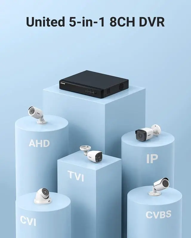 Tried-and-True Safe GuardThis one-stop security solution includes 8pcs 1080p wired cameras & 8CH 5MP lite DVR that works with TVI, AHD, CVI, CVBS & IP cameras. The DVR can hook up with 1080P@30fps cams or 5MP@20fps ones. Plus, the advanced sensor & smart IR capture clear images up to 100ft away.