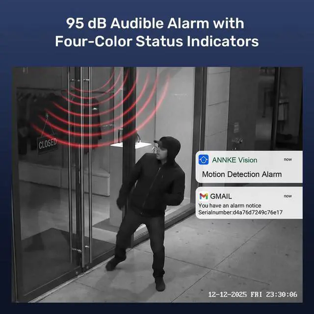 Enhanced Security with Visual & Audio Warnings Deter intruders proactively. The camera supports intrusion detection and line crossing with human/vehicle filtering to reduce false alarms. When threats are detected, it triggers a loud beep alarm (up to 95dB) and a four-color status indicator light, providing an immediate visual and audible deterrent