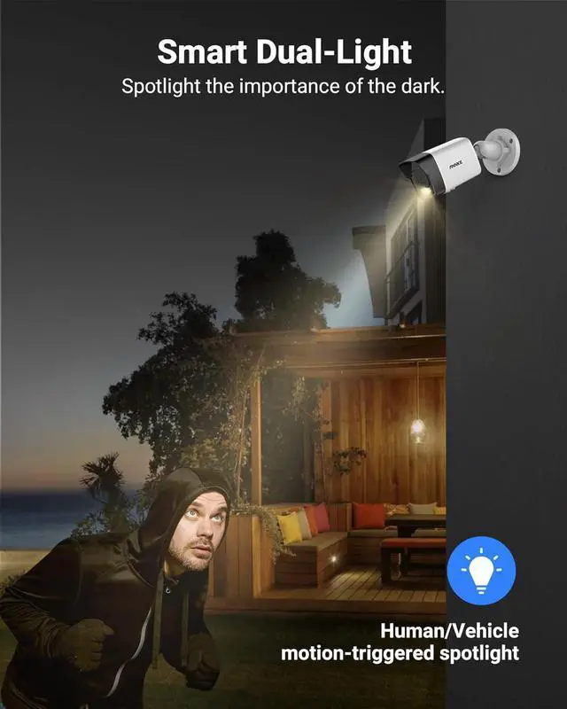 Smart Dual-Light Technology - Automatically switches from infrared to white light mode when it detects a person or vehicle, with a 30m infrared range and a 20m white light range.