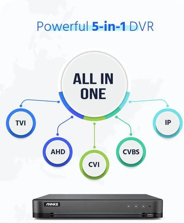 5-in-1 Hybrid DVR: The digital video recorder supports up to 16pcs 8MP TVI/AHD/CVI/CVBS and extra 4 IP cameras. Worry no more for camera signal