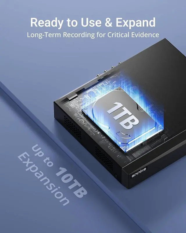 • 5-in-1 Hybrid DVRThis expandable hybrid DVR supports up to 8 analog cameras (TVI/AHD/CVI/CVBS) plus 2 additional IP cameras. It seamlessly integrates DVR, NVR, and HVR functions into one future-proof system. For optimal performance, we recommend pairing with ANNKE cameras.