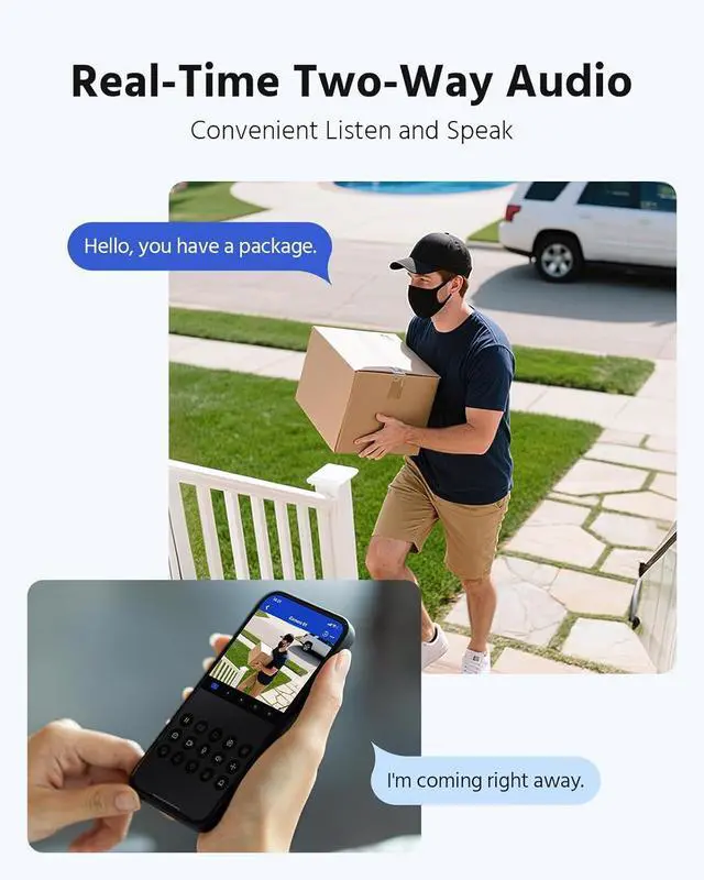 AI Human/Vehicle Detection & 2-Way Audio--Equipped with deep learning algorithms, it accurately distinguishes between people and vehicles, achieving 99% accuracy and significantly reducing false alarms. The built-in microphone and speaker enable clear real-time communication, allowing you to interact with visitors or warn off potential intruders directly