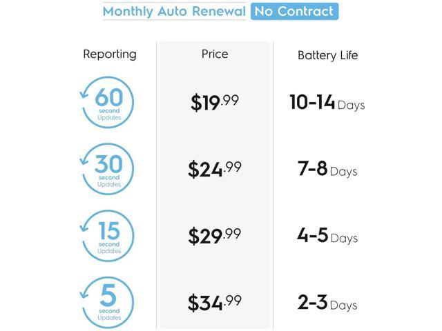 - COMPACT 4G GPS TRACKER - Tracks vehicles, loved ones, or assets. Monthly subscription required. No contracts or activation/cancellation fees. $19.9 –60 second updates. $24.99–30 second updates. $29.99–15 second updates. $34.99–5 second updates.