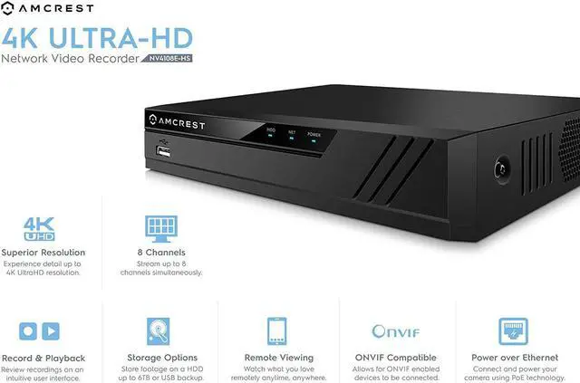 Plug & Play setup, Easy to configure, access and control. Scan QR Code on NVR from "Amcrest View" app to instantly access live viewing and playback. Connects to and manages all the POE IP cameras on your network directly through their ethernet cables for ultimate ease and convenience in a home security syste