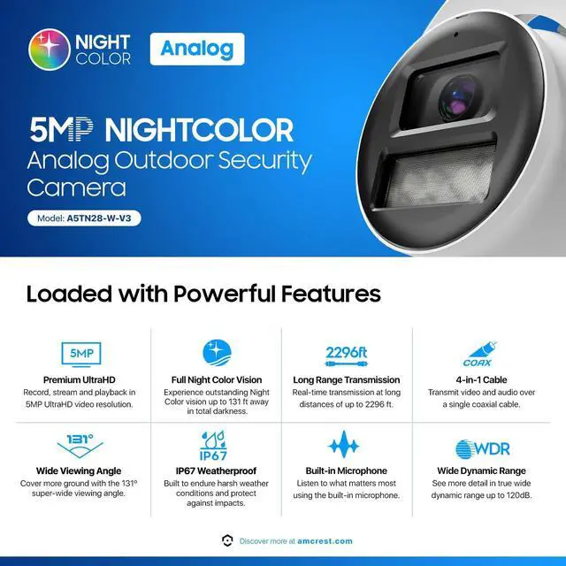 NightColor Features an enhanced low-light image sensor and chipset that allows for full night vision, in color up to 131 feet, this outdoor Turret Analog Security Camera features a heavy-duty metal weatherproof IP67 housing, a built-in microphone for one-way audio.