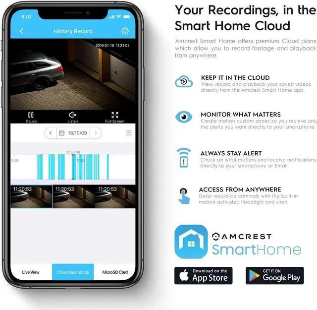 SMARTER SECURITY Receive motion detection alerts via email or push notifications and instantly review recorded footage directly from your smartphone using the Amcrest Smart Home app. Securely store your HD footage to the Amcrest Smart Home Cloud or store directly to a class 10 MicroSD card up to 256GB (sold separately) for continuous recording. (Limited compatibility with Amcrest View Pro, not compatible with Amcrest Cloud)