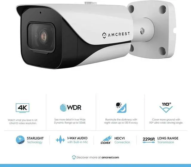 Connect your Amcrest BNC / Coax 4K camera to an Amcrest 4K DVR to view, record and playback video from anywhere in the world in superior 4K UltraHD resolution, 4K @15fps. Wide Dynamic Range up to 120dB. Amcrest 4K Camera compatible with the following Amcrest DVRs; ASINs: B07R6TBM7Y, B07HPB7D9F, B07HPCYLQ5. Not compatible with 3rd Party DVRs.