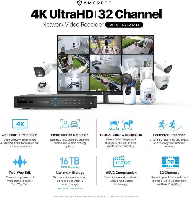 Amcrests NV5232-EI NVR supports hard drives up to 2 x SATA Ports, 16TB Capacity while Featuring 32CH Recording (No PoE Ports), Playback & Live View up to 4K Resolution @ Real-Time 30fps. View up to 8CH @ 4K @ 30fps simultaneously and the NVR will dial the remaining channels to 1080P @ 30fps.