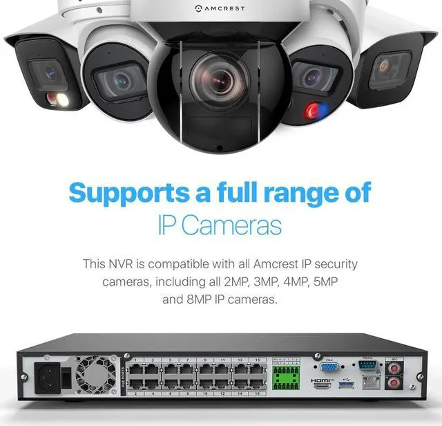 Advanced AI Human & Vehicle Detection, Face Detection & Facial Recognition, allow you to confirm the identity of entering individuals and vehicles. Supports ANPR for use with Amcrest license plate reader cameras to search and view license plate data. Other AI NVR features include Heat Map, People Counting and IVS features such as tripwire and intrusion for advanced perimeter protection (Other IVS features available with the Amcrest AI Cameras; ASIN: B0BZDTXHQC, B0C3NW752S, B0BVD828SB, B0BNM2SGPS, B0BMWFTFLS, B0837485XG, B0CMVV65K1, B0BRTC1S26). Connect and manage all Amcrest WiFi and PoE cameras connected to your network via an Ethernet cable for ultimate ease and convenience.