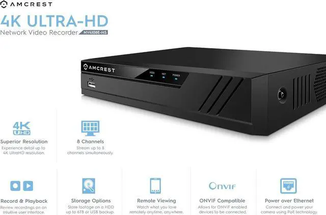 Plug & Play setup, Easy to configure, access and control. Scan QR Code on NVR from the "Amcrest View Pro" app to instantly access live viewing and playback. Connects to and manages all the POE IP cameras on your network directly through their ethernet cables for ultimate ease and convenience in a home security system.